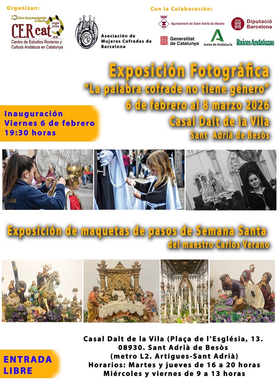 La Asociación de Mujeres Cofrades de Barcelona y el Centro de Estudios Rocieros y Cultura Andaluza en Cataluña (CERCAT), que este año celebra su vigésimo aniversario, organizan la exposición “La palabra cofrade no tiene género”, que podrá visitarse del 6 de febrero al 8 de marzo en el Casal Dalt de la Vila de Sant Adrià de Besòs (plaça de l'Església, 13, cerca de la parada de metro de la L2 Artigues Sant Adrià. El día de la inauguración, el próximo viernes 6 de febrero a partir de las 19.30 horas, organizará una mesa redonda bajo el título "Las mujeres cofrades del futuro" en la que participarán diversas mujeres de hermandades y cofradías para hablar del papel de la mujer en los diferentes momentos de la vida, en la infancia, la adolescencia y la madurez.
